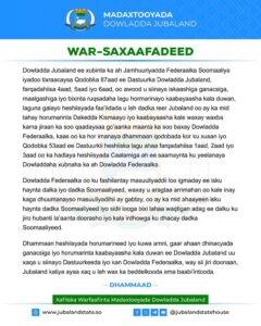 Dowlad-goboleedka Jubbaland ayaa hoosta ka xariiqay muhiimadda ay leedahay in la ixtiraamo nidaamka federaalka, wadatashiga iyo wada-shaqeynta u dhaxeysa Dowladda Federaalka iyo dowlad-goboleedyada, si loo ilaaliyo xasilloonida siyaasadeed iyo danaha guud ee dalka.